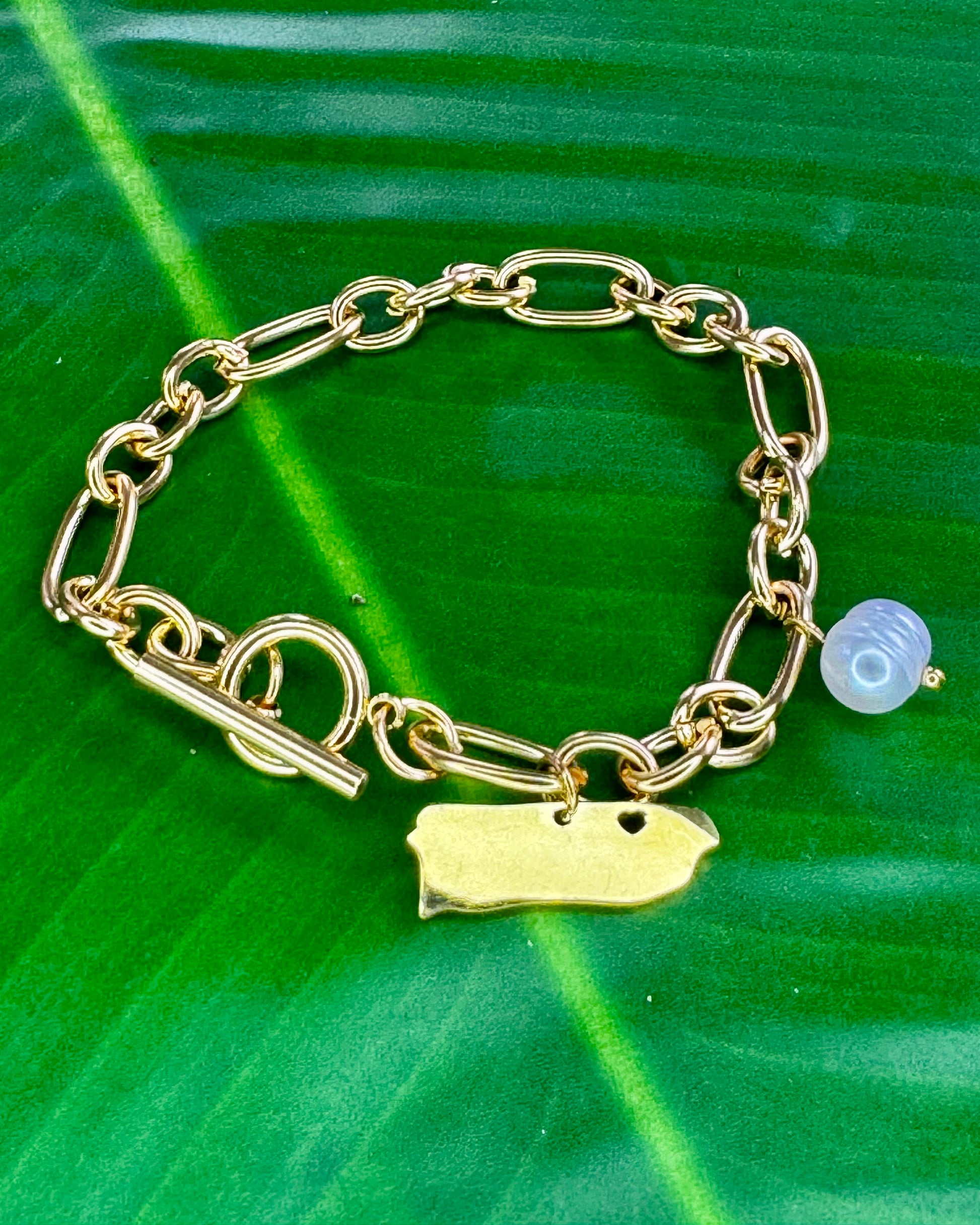 "Add a touch of elegance with our Puerto Rico 🤍 Pearl Bracelet. Crafted with a 7.25 inch stainless steel chain, this bracelet features a pearl and Puerto Rico island charm adorned with a small heart. A perfect accessory for any occasion, representing your love for Puerto Rico."